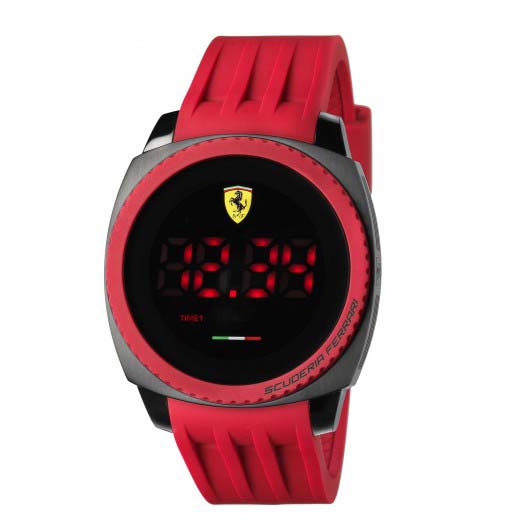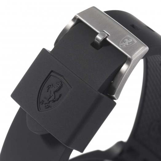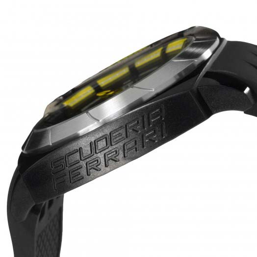 Aerodynamics and aesthetics blend seamlessly in this line of casually sophisticated Scuderia Ferrari timepieces. Designed to hit the racetrack in sleek, wind-deflecting style, Aerodinamico features an integrated, ventilated silicone strap molded to echo the design of the diffuser on the Scuderia Ferrari single-seater. Its masculine 46mm TR90 thermoplastic chassis reveals a distinctive stepped case design with curved rectangular contours..